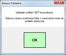 Pokud se zaškrtne volba „Ověřovací režim EET“, bude po uhrazení účtu platbou, která vytváří daňové doklady odeslána zpráva v ověřovacím módu. Ověřovací mód slouží k otestování komunikace se serverem finanční správy. Pokud je vše správně nastaveno (viz níže) a komunikace je funkční vrátí server finanční správy odpověď „Datovou zpravu evidovane trzby v overovacim modu se podarilo zpracovat“