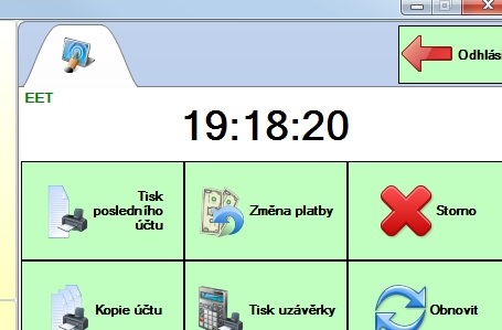 Pokud je zapnuta EET pro vybranou pokladnu, zobrazí se v oblasti hodin vlevo nahoře zelený nápis „EET“: