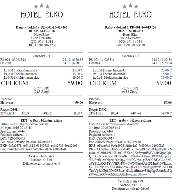 Vlevo příklad účtenky úspěšně odeslané do EET (obsahuje FIK) a vpravo příklad účtenky, která se do EET nepodařilo z důvodu chyby odeslat (obsahuje PKP):