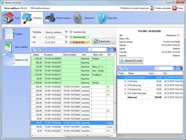 Při zapnutém EET na pokladně se změnilo chování funkcí „Změna platby“ a „Storno“ (z uzavřeného účtu). Uživatelsky se nic nemění, avšak na pozadí se v případě obou funkcí vytvoří stornoúčet k původnímu účtu (stejný jako účet původní, jen hodnoty všech položek, platba a údaje o DPH jsou oproti původnímu úču záporné). Tento stornoúčet je poslán do EET a vytištěn na tiskárně. Zároveň je vytvořen nový kladný účet, který zohledňuje provedené změny. V případě změny platby obsahuje novou platbu a v případě storna z uzavřeného účtu jen položky, které nebyly stornované. Zároveň zůstala zachována i možnost uložení opraveného účtu na stůl. Nový uzavřený účet je samozřejmě také zaslán do EET.