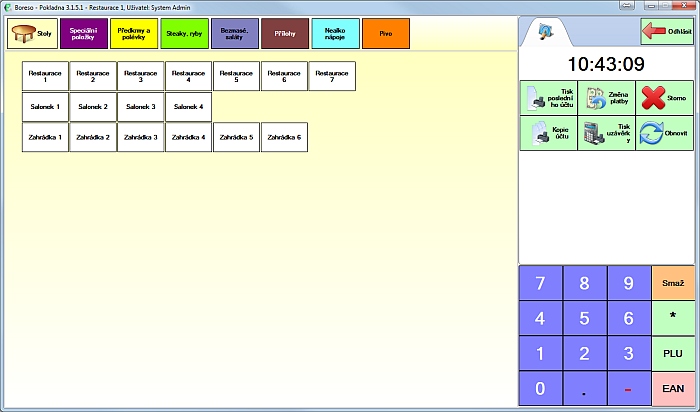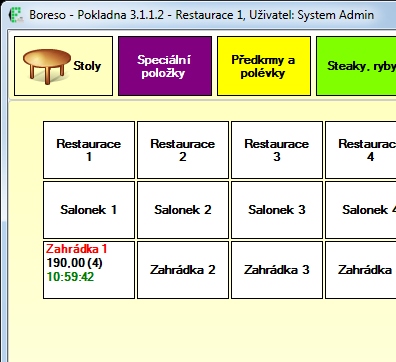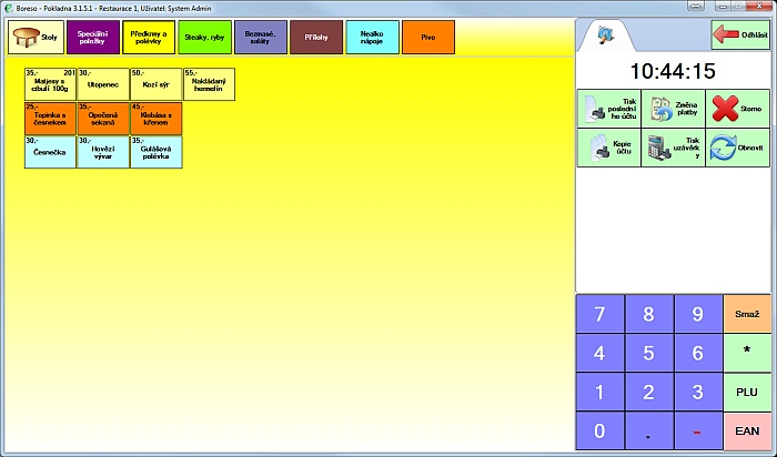 Po kliknutí na nějakou skupinu se na tuto barvu změní i barva pozadí pokladny. A zobrazí se položky, které v této skupině máme. Takto například vypadá skupina "Předkrmy a polévky".