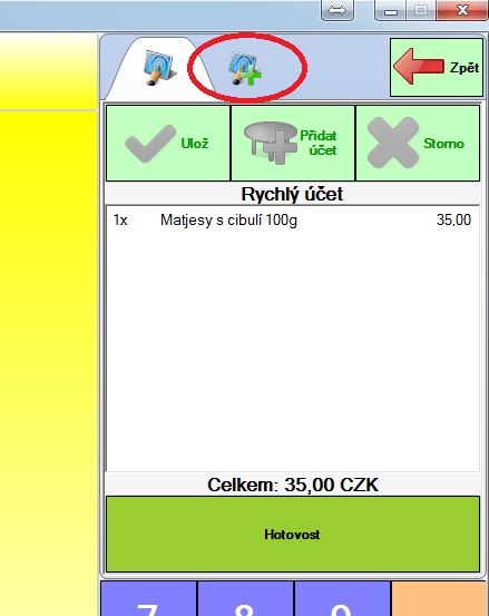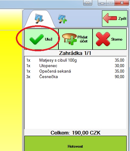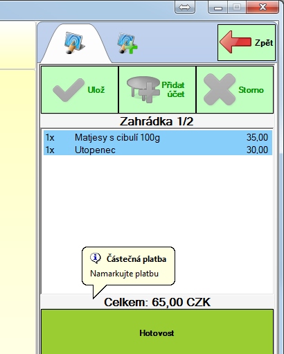 Účet můžeme také rovnou zaplatit platbou, ale většinou ho budeme chtít uložit na stůl a později se k němu vrátit. Uložíme tedy účet tlačítkem "Ulož". Účet se automaticky uloží např. i ve chvíli, kdy založíme nový účet kliknutím na jiný stůl. Zrušit, co jsme právě namarkovali můžeme opět tlačítkem "Zpět" (dříve namarkované položky na účtu zůstanou).