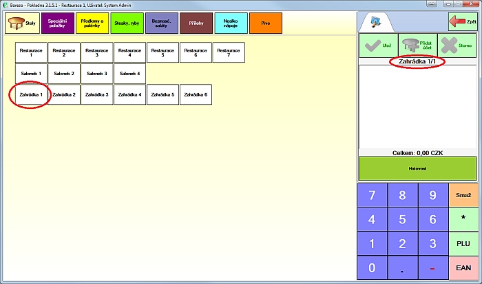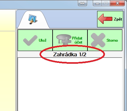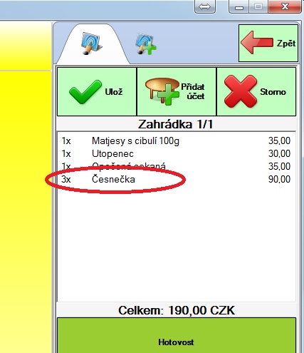 Všimněte si, že účet je označen jako "Zahrádka 1/2", číslo za lomítkem značí, že se jedná o druhý účet u stolu "Zahrádka 1".