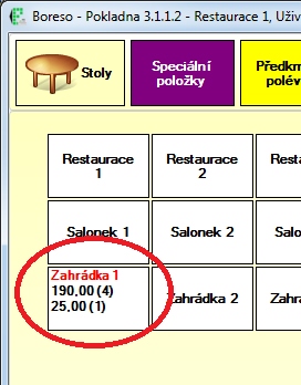 Pokud na takovýto účet namarkujem nějaké položky a uložíme ho, na tlačítku stolu nyní vidíme, že jsou na něm účty dva, jeden s útratou 190,- Kč a druhý za 25,- Kč.