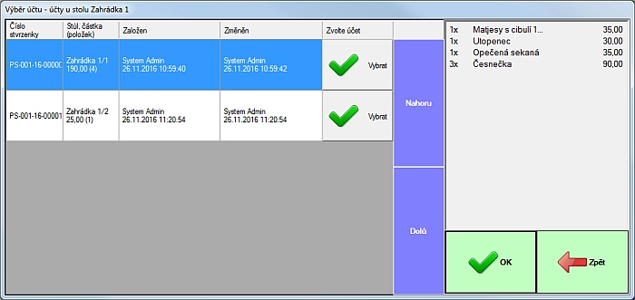 Pokud na stůl, kde je více účtů klikneme, objeví okno, kde vyberem, který z nich chceme otevřít pro markování.
