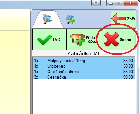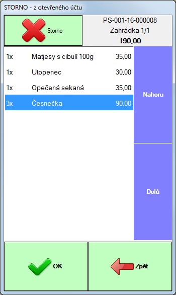 Otevře se okno pro stornování položek. Klikneme na položku, kterou chceme stornovat (aby byla modře označena) a stiskneme tlačítko "Storno". Položku lze vystornovat i tak, že na ní dvojklikneme.