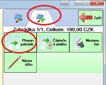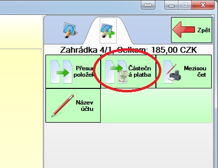 Automaticky se znovu otevře okno pro částečnou platbu, kde můžeme stejným způsobem zaplatit další část položek nebo okno zavřít tlačítkem "Zpět", pokud chceme nechat zbytek položek na stole.