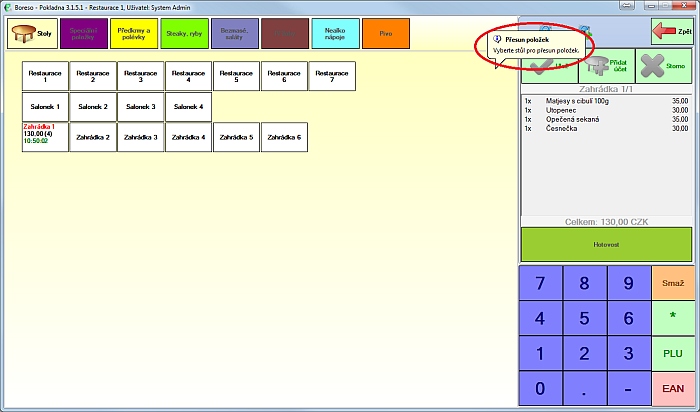 Obejví se bublina s nápovědou "Vyberte stůl pro přesun položek". Klikneme tedy na stůl, kam chceme položky přesouvat.