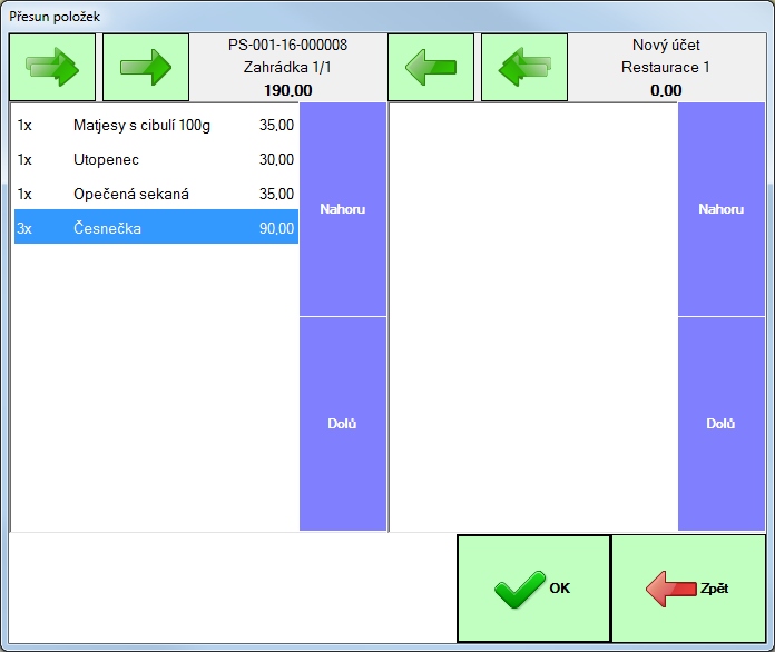 Otevře se okno, podobné oknu pro přesun položek. Do pravé části přesuneme položky, které chceme zaplatit a stiskneme tlačítko "Zaplatit".