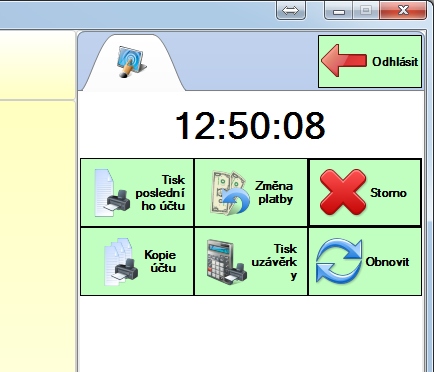 Slouží ke znovunačtení pokladny. Pokud jsme například v aplikaci BORESO Admin přidali na pokladnu novou položku, použijeme toto tlačítko, aby se znovu načetly položky pokladny a nemuseli jsme pokladnu vypínat a znovu zapínat.